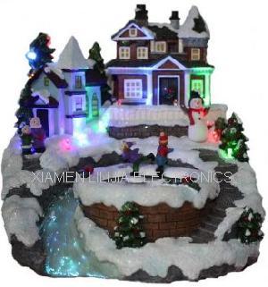Christmas house: 1)material: polyresin 2)size: 26*24*27cm 3)power: battery/adapter 4)feature: fiber light,musical, rotate |