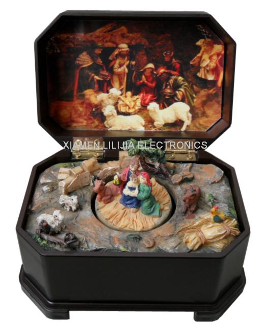 Open the lid, holy family figurine in the middle rotates in a circle as the music plays. Close the lid to stop the song until you open the box again.