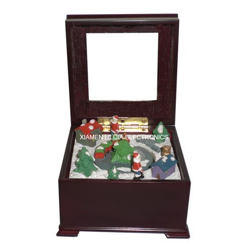 Open the lid, the mini train in the middle rotates in a circle as the music "Jingle Bells" plays.  Close the lid to stop the song until you open the box again.