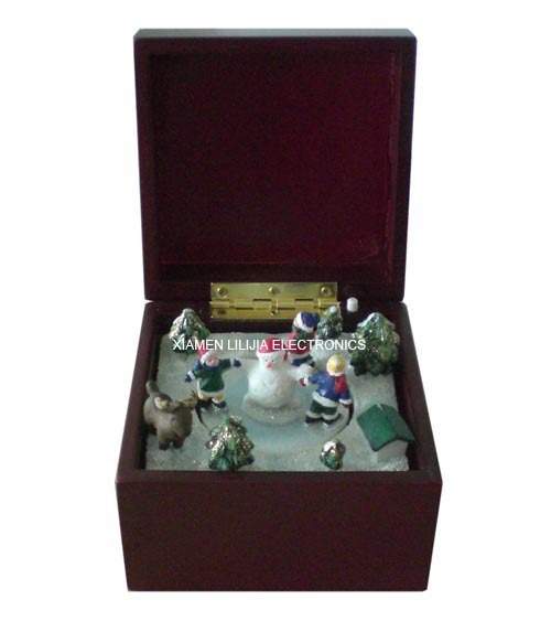 Open the lid, the snowman and skaters in the middle rotates in a circle as the music "Joy to the World" plays.  Close the lid to stop the song until you open the box again.