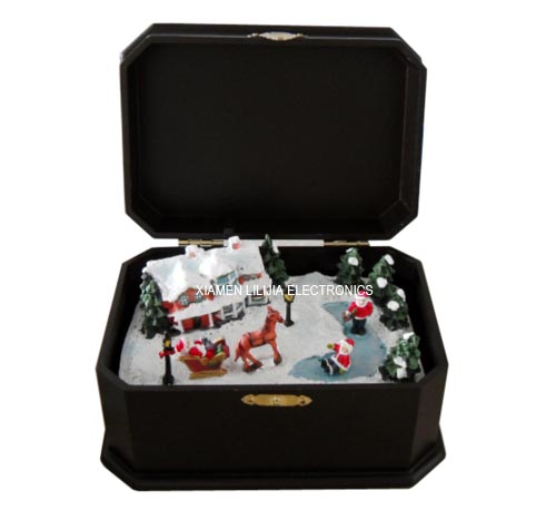 | Just open the lid, the cute music box plays 8 christmas carols and sparkles with fiber optic light in changing colors. Close the lid to stop and open to start again.