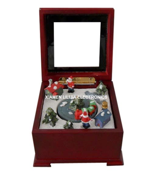 Open the lid, the mini train in the middle rotates in a circle as the music "Jingle Bells" plays. Close the lid to stop the song until you open the box again.