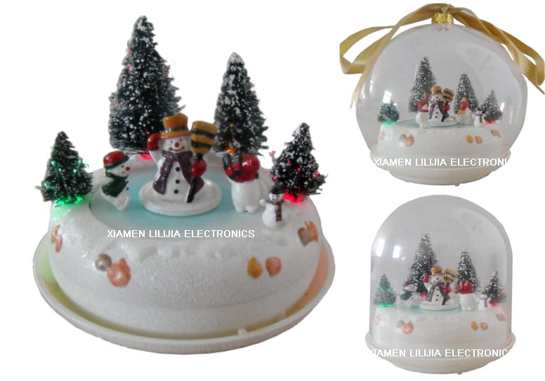 Put on the switch on bottom, three skaters rotation around the middle snowman and the trees light up in colors as music plays. (12 christmas carols music tune.)
