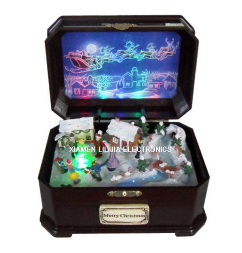 | Lift up the lid of this pretty music box to reveal a wonderful 3D miniature christmas world. This holiday scene depicts happy children, fiber river and sparkles with fiber optic light. Elegant box bears a brass plate with the inscription "Merry Christmas" on top. Also 8 christmas music tune plays as you lift up the lid. Closed the lid to stop or open the lid to start again. Require 3AA batteries.(not include)